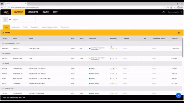 CLIP is your all-in-one equipment management program. Streamlining inventory, rentals, billing and maintenance. With real-real time tracking and automation, you will stay organized, cut downtime and boost profitability.